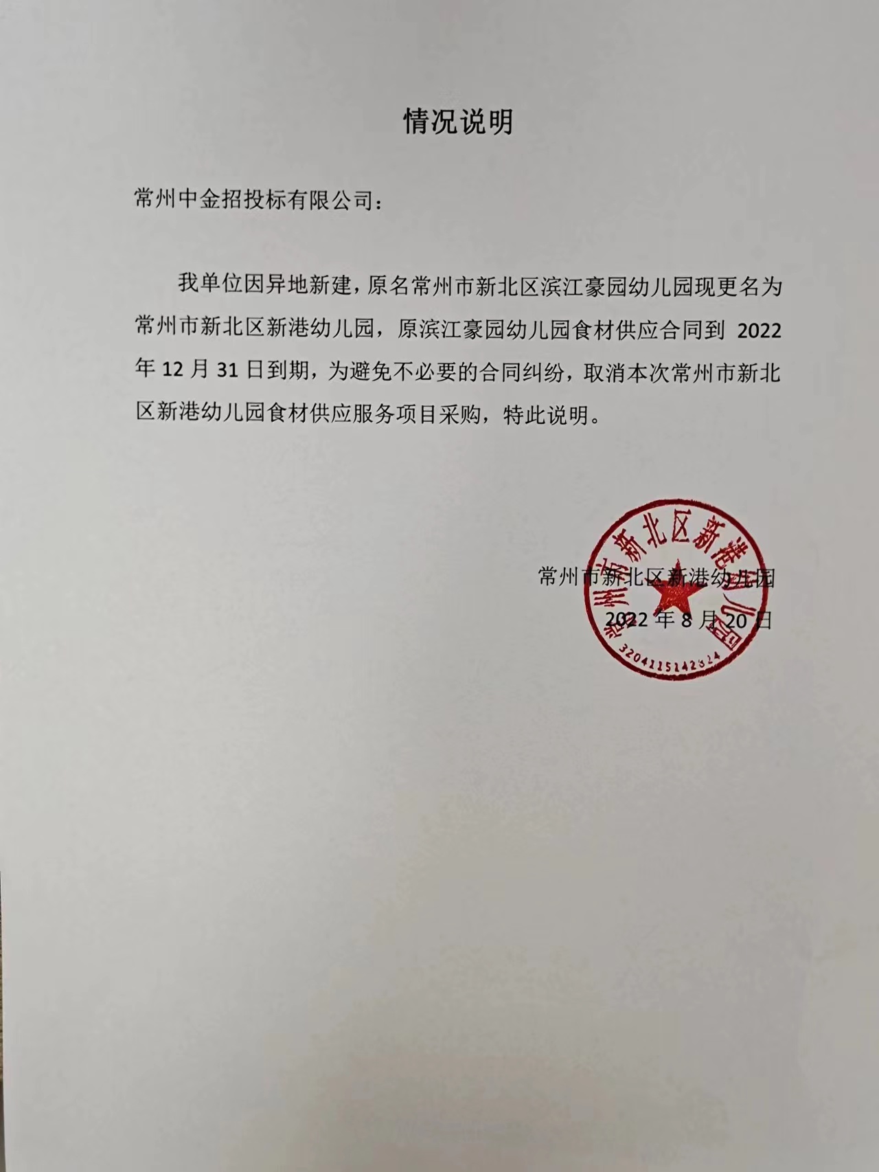 因采購單位異地新建,原常州市新北區濱江豪園幼兒園現更名為常州市新北區新港幼兒園,因原濱江豪園幼兒園食材供應合同到2022年12月31日到期,為避免不必要的合同糾紛,故將本項目予以終止。