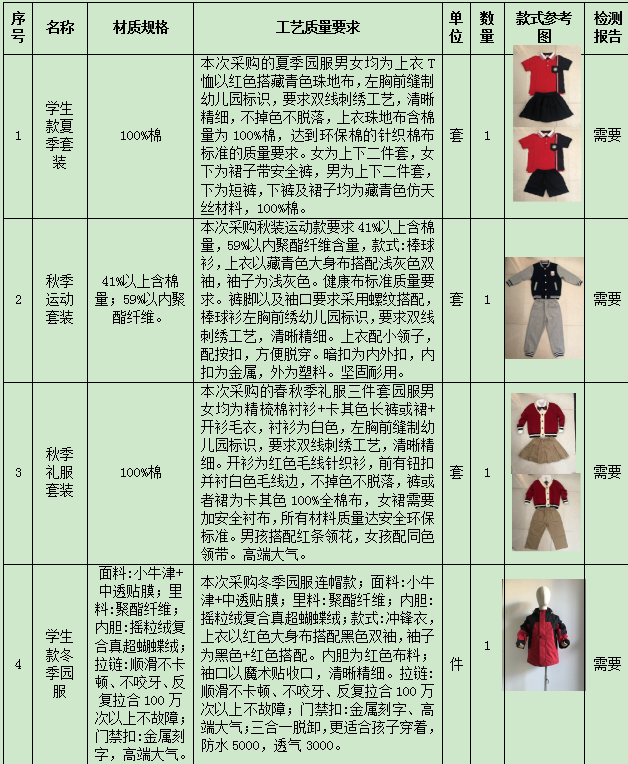 5.項目概況:本項目為常州市新北區新港幼兒園園服采購項目,包括園服制作、運抵、卸貨至采購人現場(chǎng)指定位置,通過(guò)采購人及其他相關(guān)部門(mén)的驗收,直至發(fā)放和余貨取回等全過(guò)程工作。其中每套園服包含:夏季套裝1套,秋季運動(dòng)套裝1套、秋季禮服套裝1套、冬季園服1件。成交單位需等到采購人新生報到,征得2/3以上家長(cháng)同意后,雙方才履行合同,采購人負責將采購款式、數量交予成交單位,成交單位按照采購人提供的款式、顏色要求制造校服,校服面料必須與采購需求中一致。貧困學(xué)生校服征訂工作按教育主管部門(mén)相關(guān)文件執行。成交單位還需要承擔其他班級園服的增訂工作,具體數量?jì)r(jià)格按照現有標準實(shí)行。